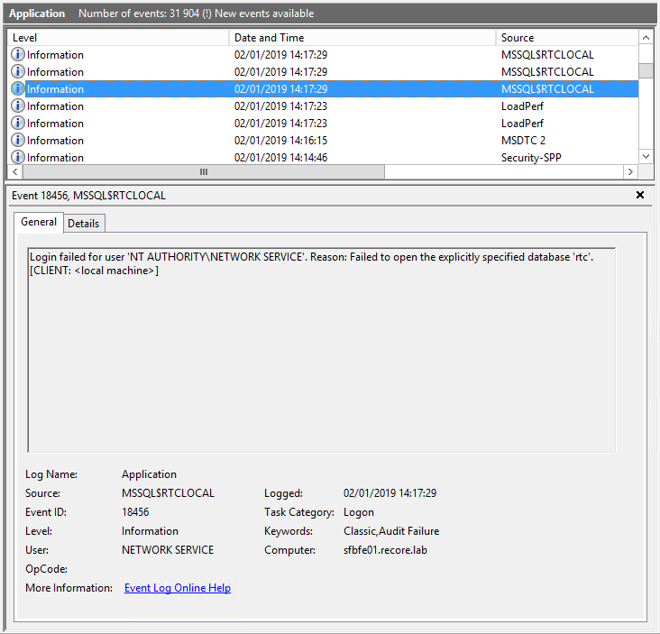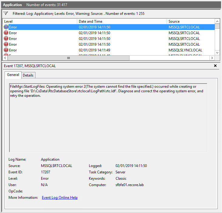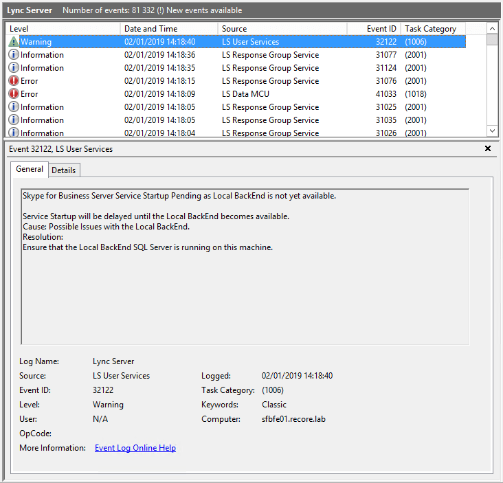 While troubleshooting an issue where the Front End Service wasn’t starting, we notice that the Event Viewer > Applications and Services Logs > Lync Server had references to the local database unavailability: