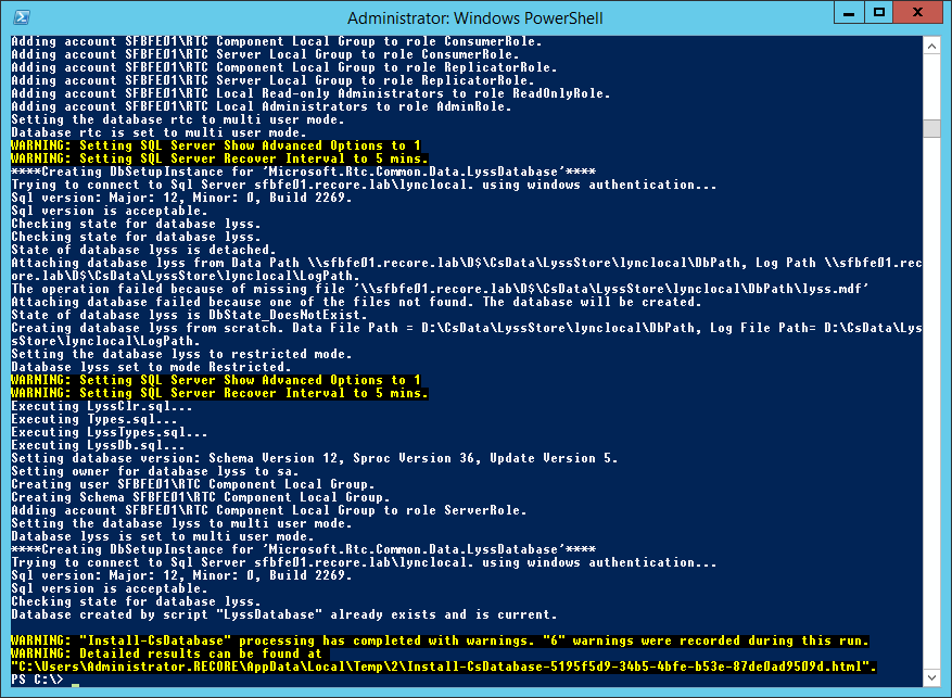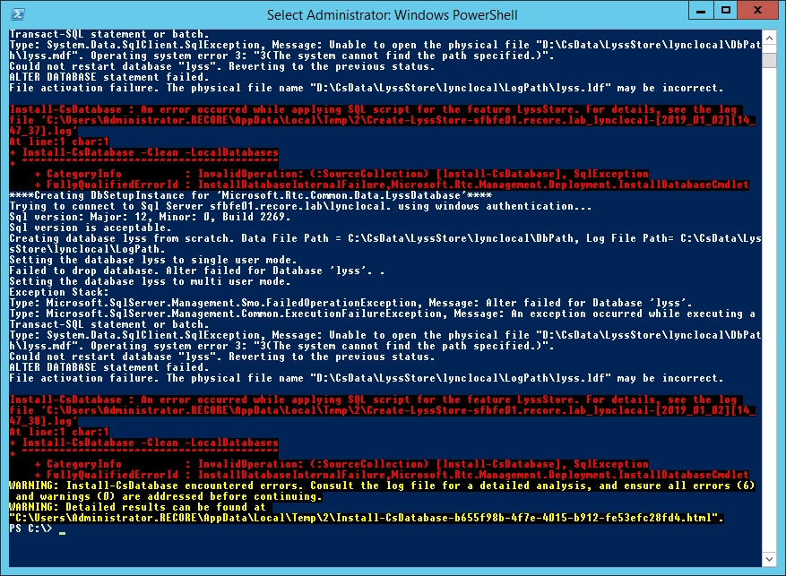 An error occurred while applying SQL script for the feature RtcDatabaseStore. For details, see the log file ‘C:\Users\Administrator.RECORE\AppData\Local\Temp\2\Create-RtcDatabaseStore-sfbfe01.recore.lab_rtclocal-[2019_01_02][14_52_01].log’